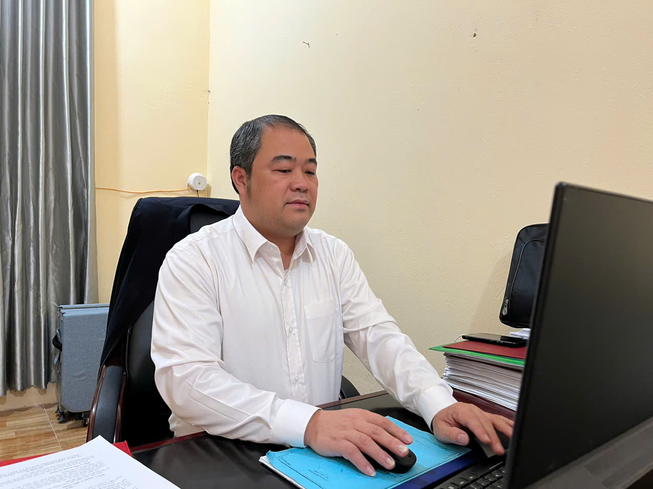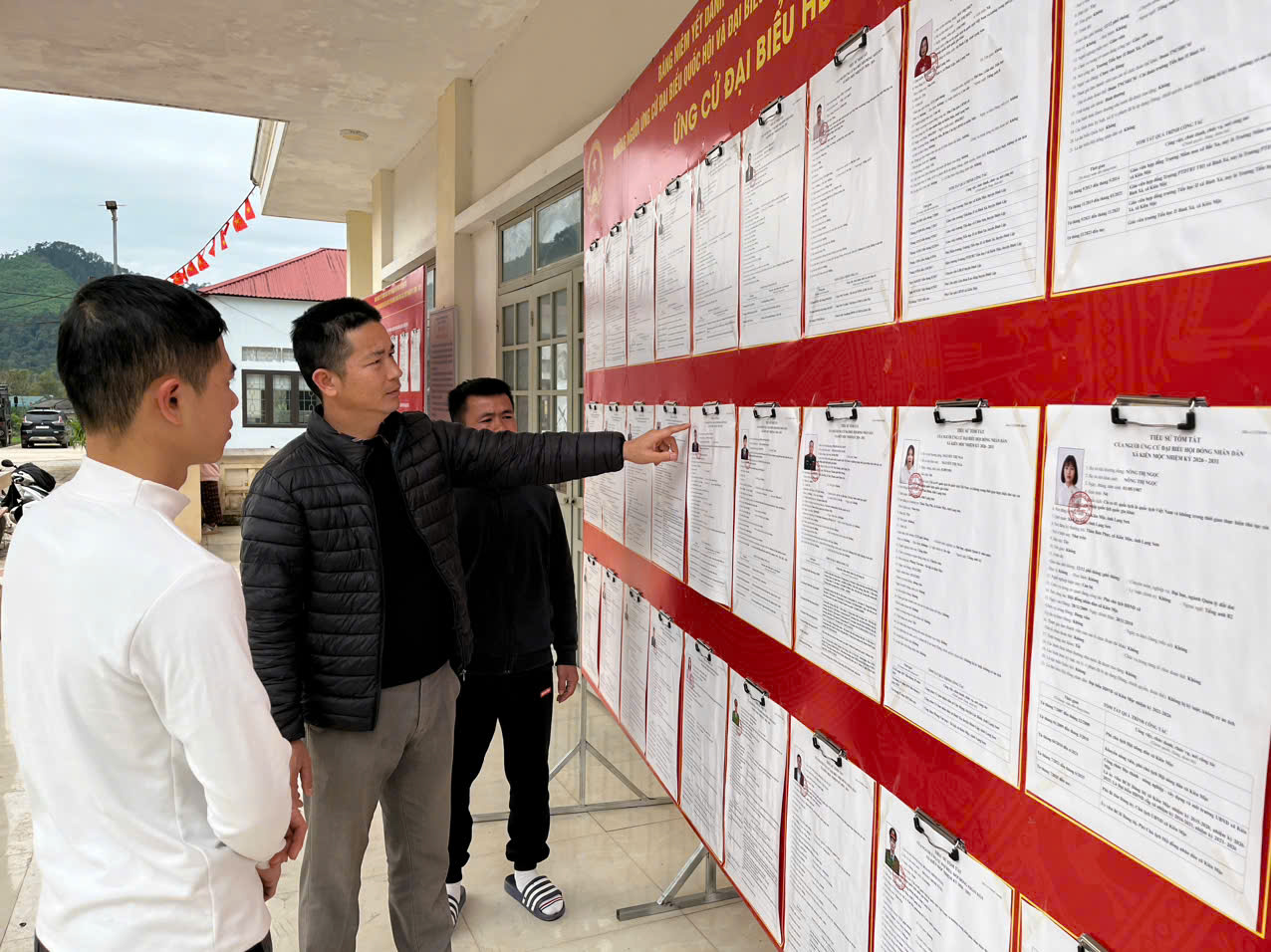 Đồng chí Hoàng Văn Hội – Phó Bí thư Đảng uỷ, Chủ tịch UBND xã, Chủ tịch Uỷ ban bầu cử xã kiểm tra văn bản tuyên truyền bầu cử