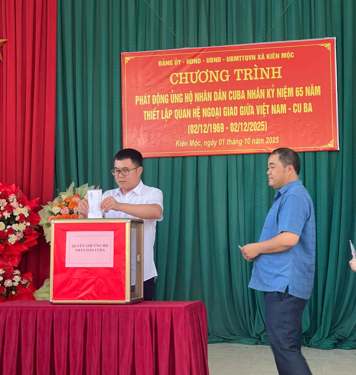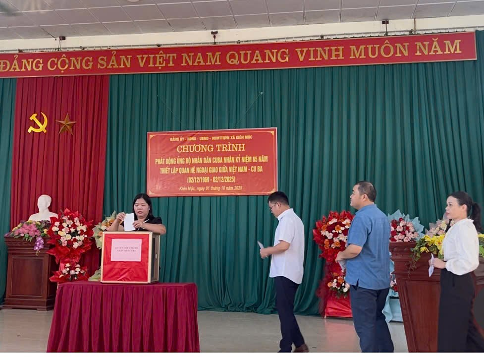 Sáng 30/9, Đảng uỷ, HĐND, UBND, UBMTTQ Việt Nam xã Kiên Mộc tổ chức phát động ủng hộ nhân dân Cuba nhân kỷ niệm 65 năm thiết lập quan hệ ngoại giao Việt Nam - Cuba (1960 - 2025). Đồng chí Hoàng Thị Kim Hoạt - Bí thư Đảng uỷ, Chủ tịch HĐND xã chủ trì buổi lễ.