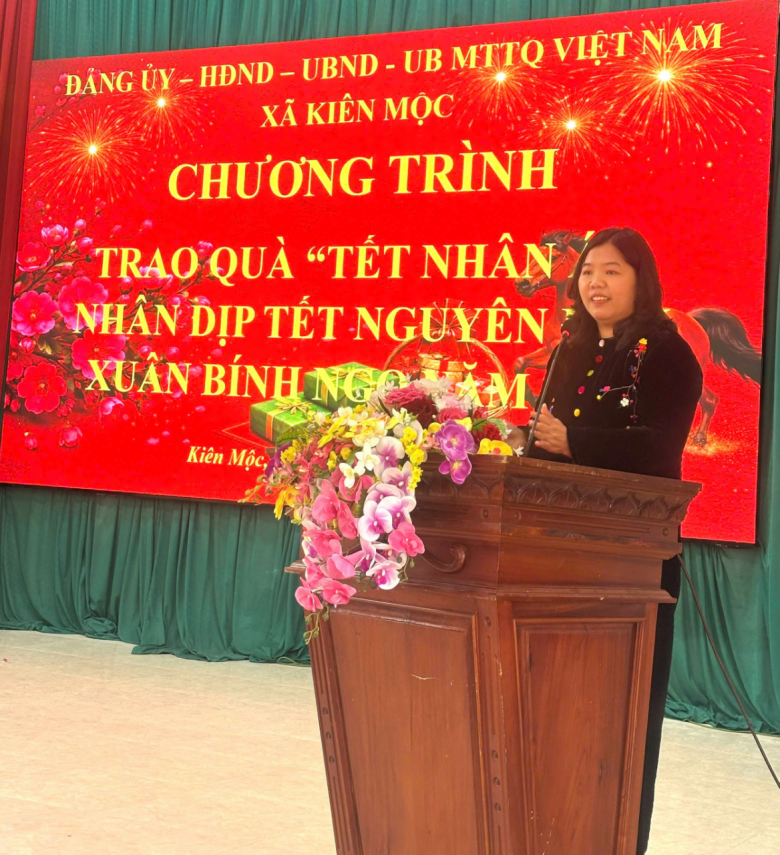 Phát biểu tại chương trình, đồng chí Hoàng Thị Kim Hoạt – Bí thư Đảng ủy chủ tịch HĐND xã ghi nhận và cảm ơn sự đồng hành của các đơn vị tài trợ, nhà hảo tâm đã góp phần lan tỏa tinh thần “tương thân, tương ái” giúp các gia đình có thêm niềm vui, động lực để đón một mùa xuân mới ấm áp, an lành. Thay mặt cấp ủy, chính quyền xã, đồng chí gửi lời chúc tới toàn thể nhân dân mạnh khỏe, hạnh phúc, bình an và tiếp tục nỗ lực vươn lên trong cuộc sống./.