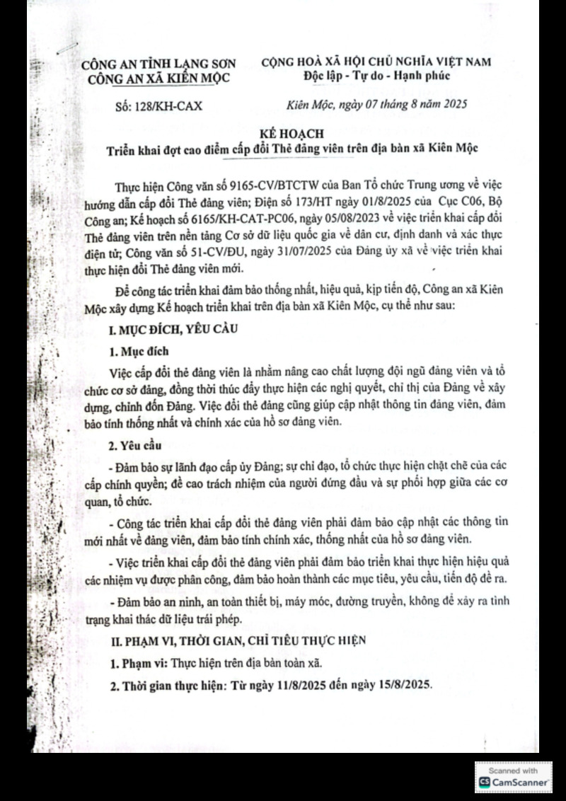 | Tiêu đề văn bản | Kế Hoạch Triển khai đợt cao điểm cấp đổi Thẻ đảng viên trên địa bàn xã Kiên Mộc | ||
