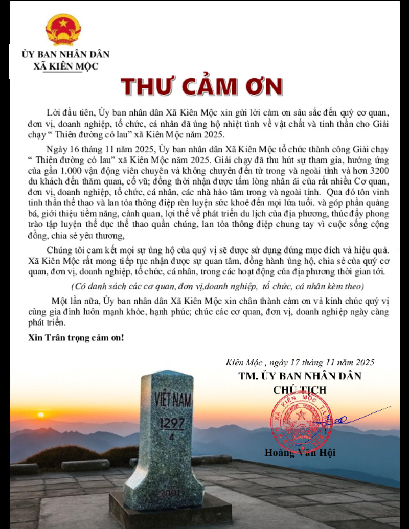 | Tiêu đề văn bản | Thư cảm ơn các cơ quan, đơn vị, doanh nghiệp, tổ chức, cá nhân ủng hộ Giải chạy " Thiên đường cỏ lau" xã Kiên Mộc năm 2025 | ||