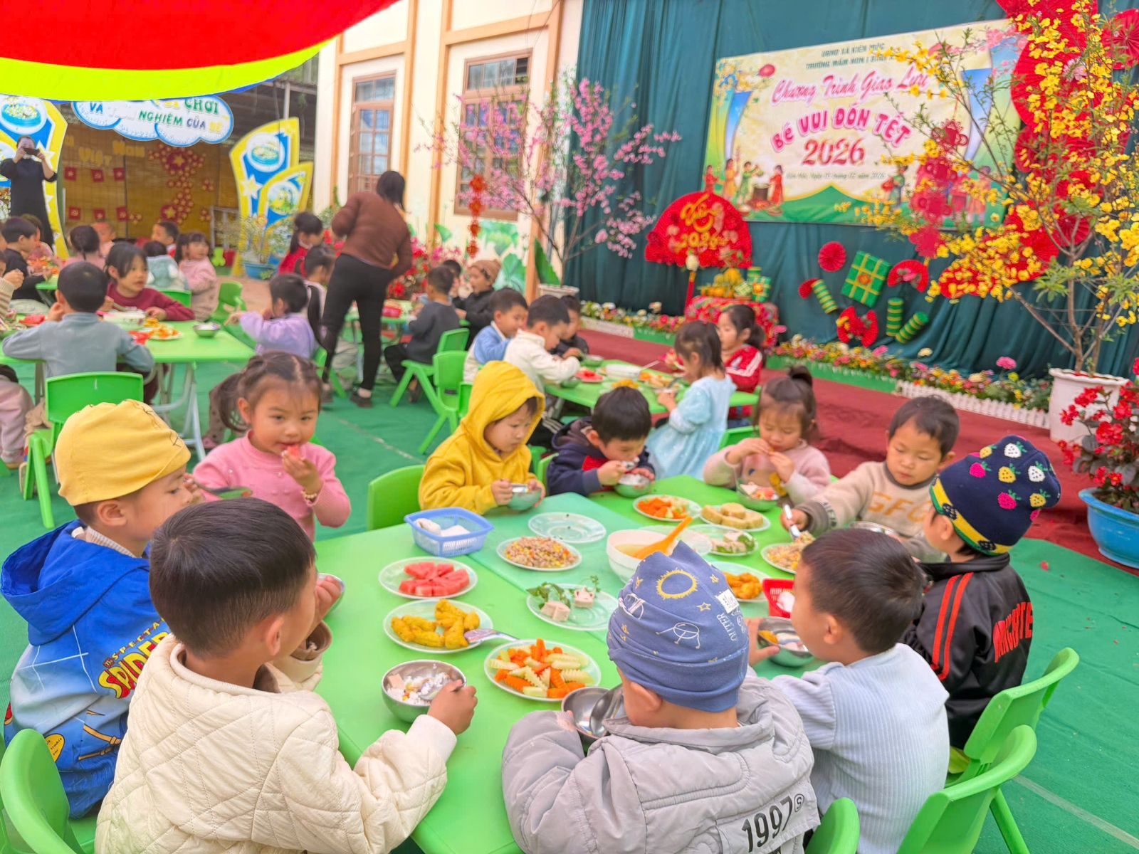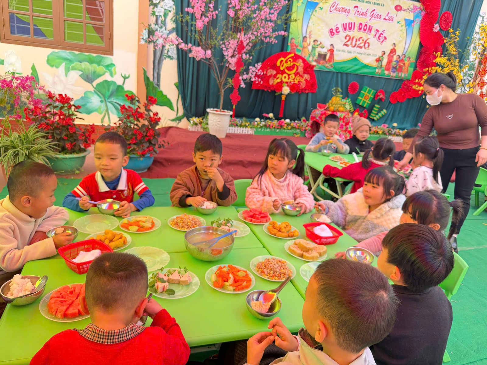 Kết hợp tổ chức “Bữa ăn thân thiện” các con đã được thưởng thức các món ăn đảm bảo đầy đủ chất dinh dưỡng, an toàn vệ sinh thực phẩm và mang đậm hương vị ngày Tết như: bánh chưng, giò, thịt băm rau củ, canh rau, trái cây tráng miệng… Tất cả đều được chế biến phù hợp với lứa tuổi mầm non, trình bày đẹp mắt giúp trẻ ăn ngon miệng và hào hứng hơn trong bữa ăn.