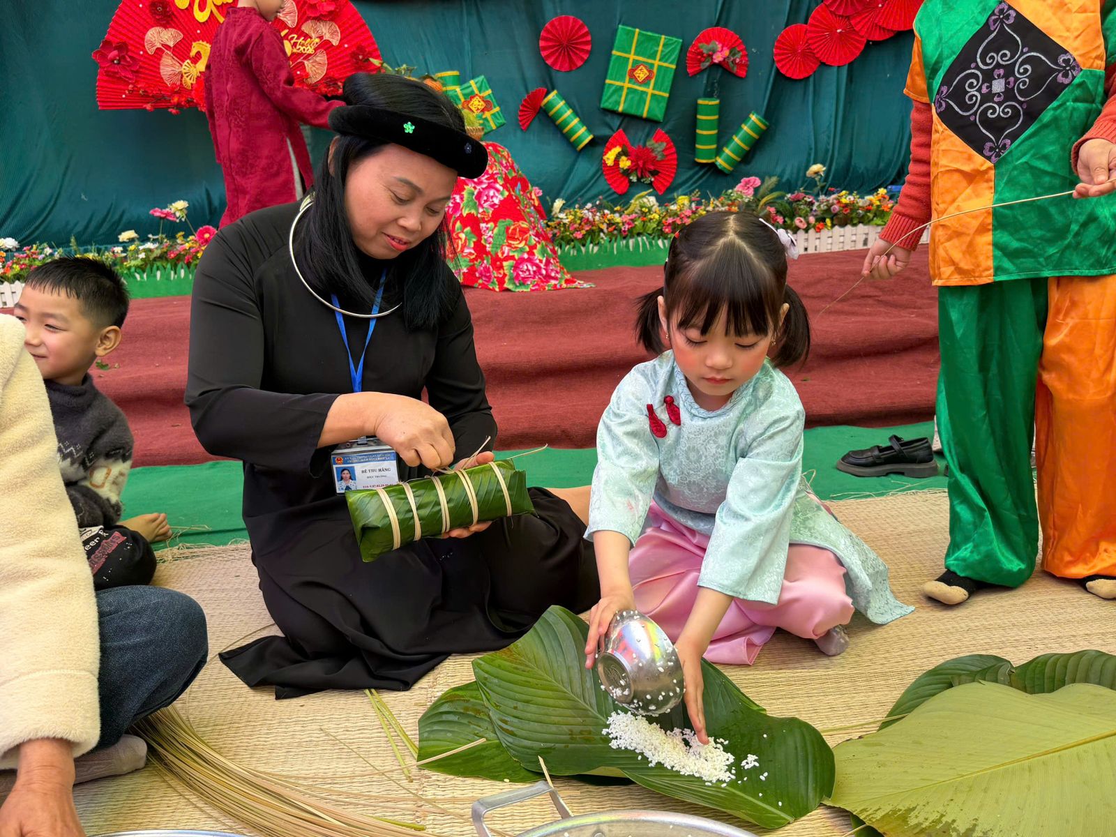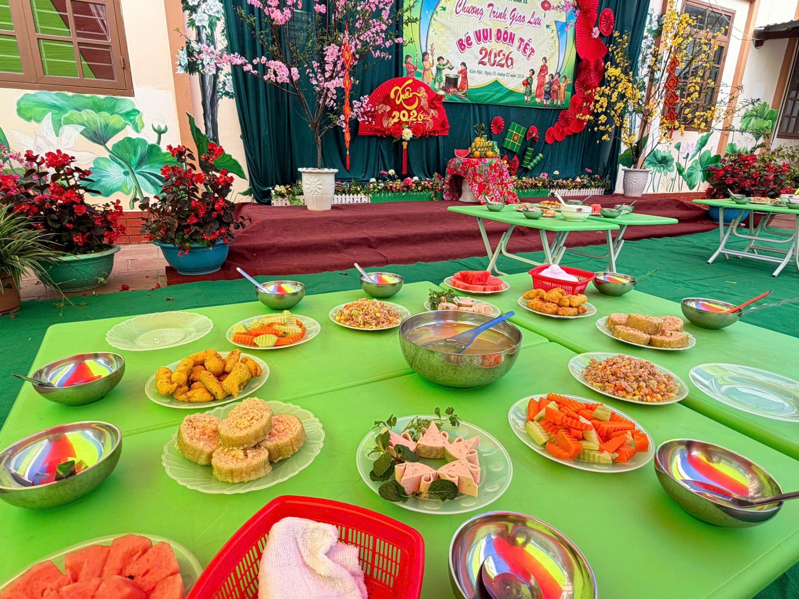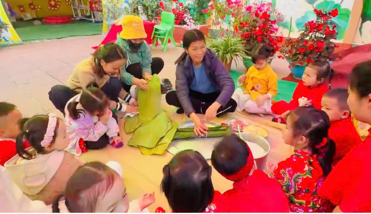 Chương trình có các phần biểu diễn sôi động, những bộ trang phục tự tạo tái sử dụng từ các nguyên vật liệu sẵn có do các bé khối mẫu giáo biểu diễn qua 2 phần thi tài năng và trình diễn trang phục tự tạo. Những bài hát, điệu nhảy về chủ đề Tết và mùa xuân đã mang đến không khí hân hoan, phấn khởi. Tổng kết chương trình kết quả đạt được: 01 giải Nhất, 01 giải Nhì, 01 giải Ba và 03 giải khuyến khích. Các bé được tham gia trải nghiệm gói bánh Chưng – một nét đẹp truyền thống của ngày Tết Việt. Dưới sự hướng dẫn tỉ mỉ của các bà, cô giáo, các bé được quan sát từng công đoạn gói bánh, được tham gia những việc đơn giản như lau lá, chuẩn bị nguyên liệu gạo, đỗ, thịt lợn,... Qua hoạt động này, các bé được làm quen với phong tục Tết cổ truyền bằng những trải nghiệm gần gũi, sinh động.