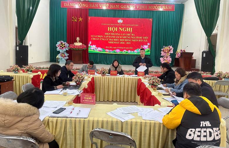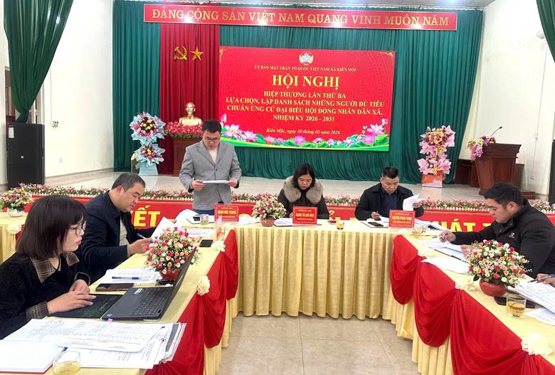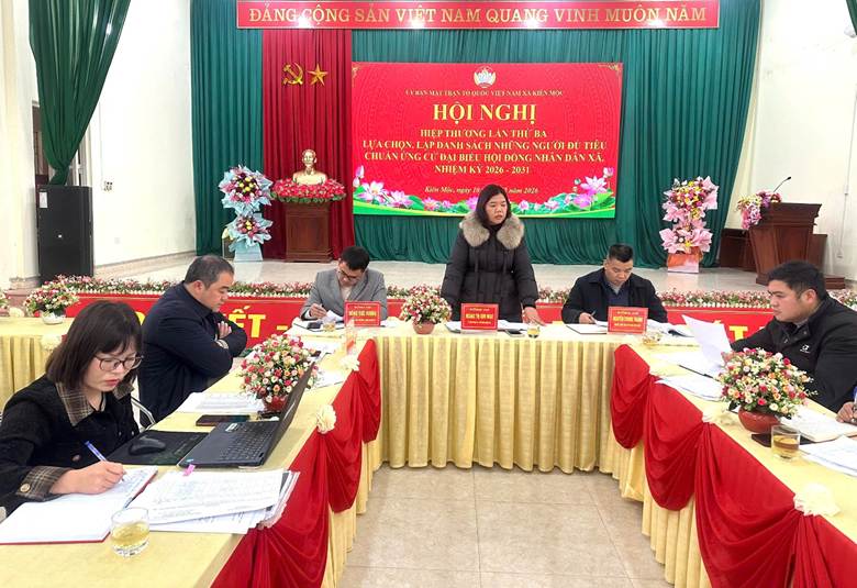 Ngày 10/2/2026, Ban Thường trực Ủy ban MTTQ Việt Nam xã Kiên Mộc tổ chức hội nghị hiệp thương lần thứ ba để lựa chọn lập danh sách những người ứng cử đại biểu HĐND xã Kiên Mộc, nhiệm kỳ 2026 - 2031. Dự hội nghị có đồng chí Hoàng Thị Kim Hoạt- Bí thư Đảng uỷ, chủ tịch HĐND xã - Trưởng ban chỉ đạo bầu cử xã; đồng chí Nông Đức Vượng, Phó Bí thư thường trực Đảng ủy; Đồng chí Hoàng Văn Hội- Phó Bí thư Đảng ủy, Chủ tịch UBND xã - Chủ tịch Ủy ban bầu cử xã; đồng chí Nguyễn Trung Thành, Chủ tịch UBMTTQ Việt Nam xã chủ trì hội nghị.