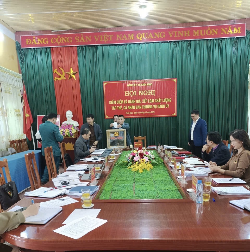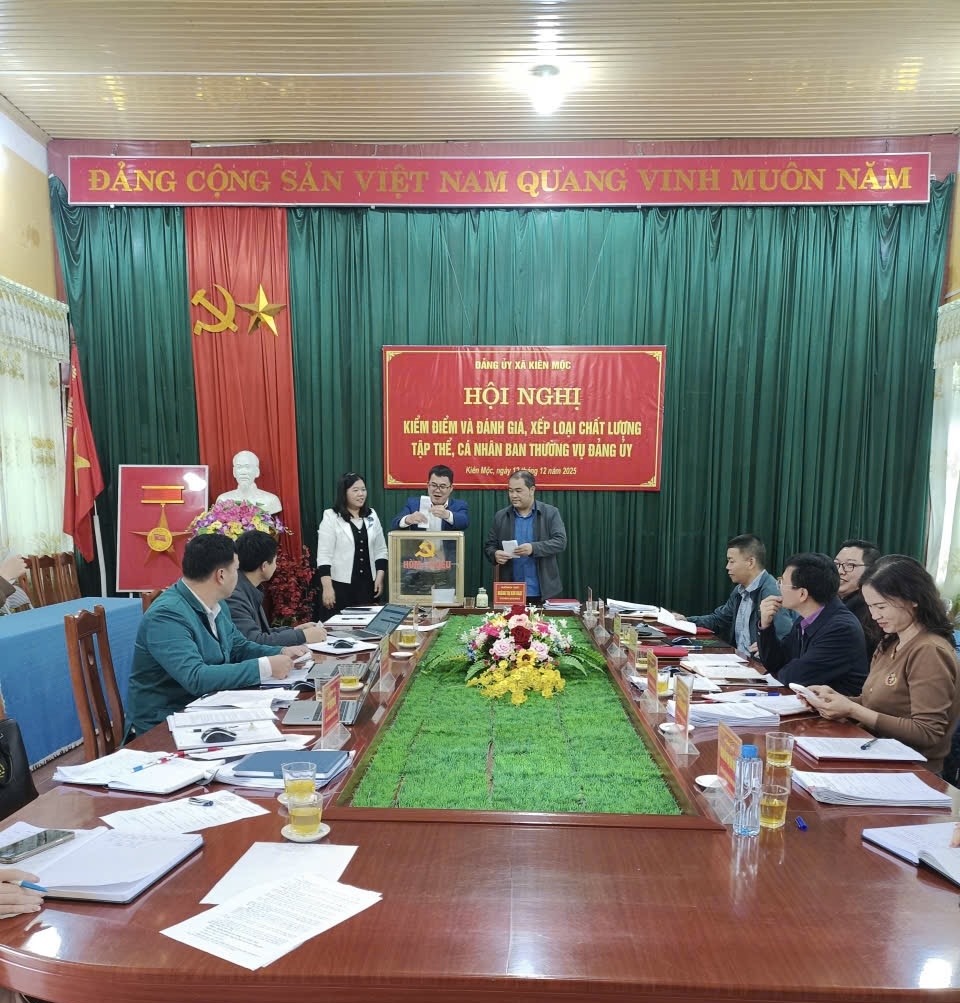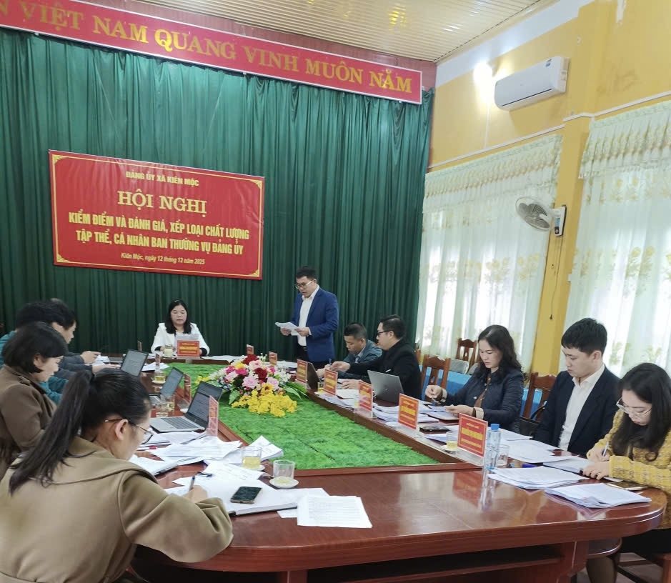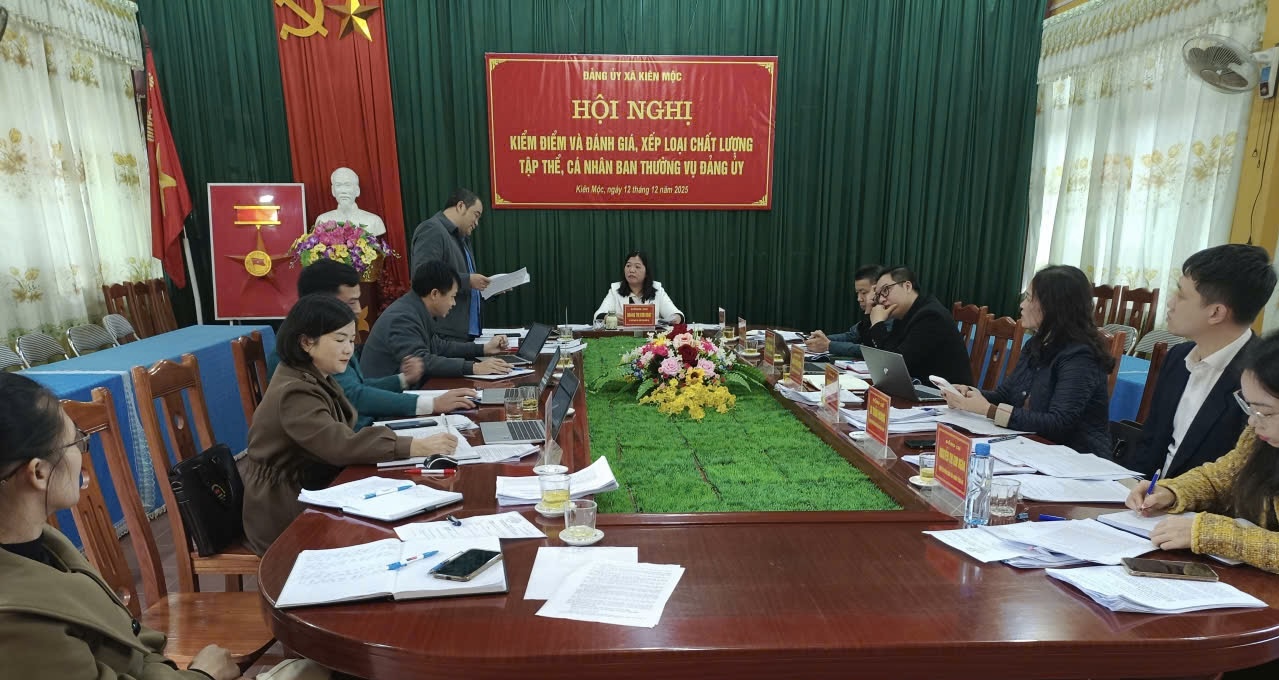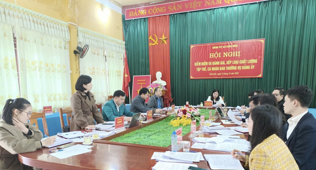 Ngày 12/12/2025, Ban Thường vụ Đảng uỷ xã Kiên Mộc tổ chức Hội nghị kiểm điểm và đánh giá, xếp loại chất lượng tập thể, cá nhân Ban Thường vụ Đảng uỷ; Chủ trì Hội nghị Đ/c Hoàng Thị Kim Hoạt, Bí thư Đảng uỷ, Chủ tịch HĐND xã