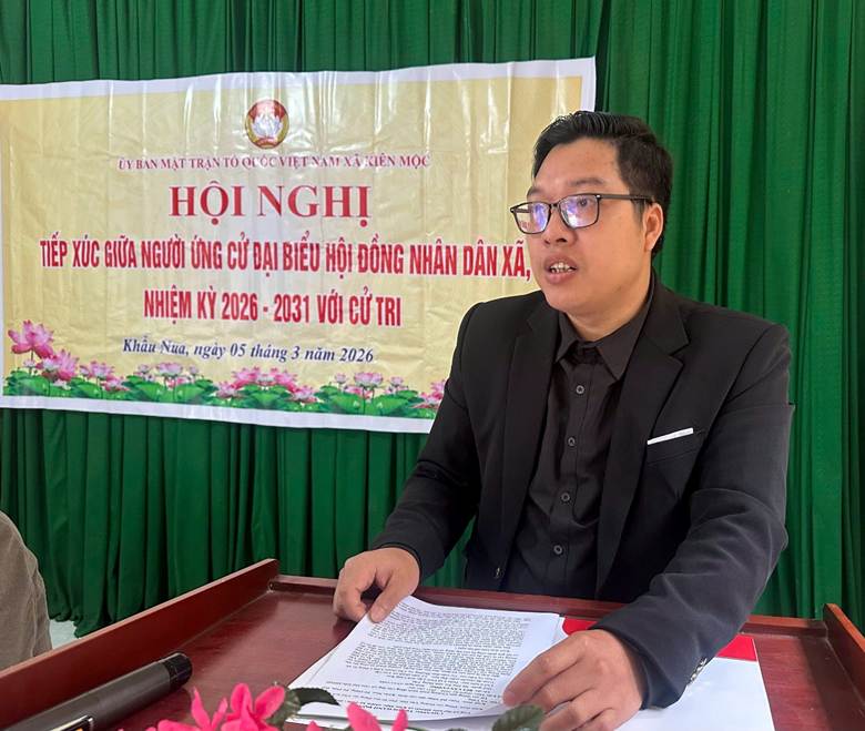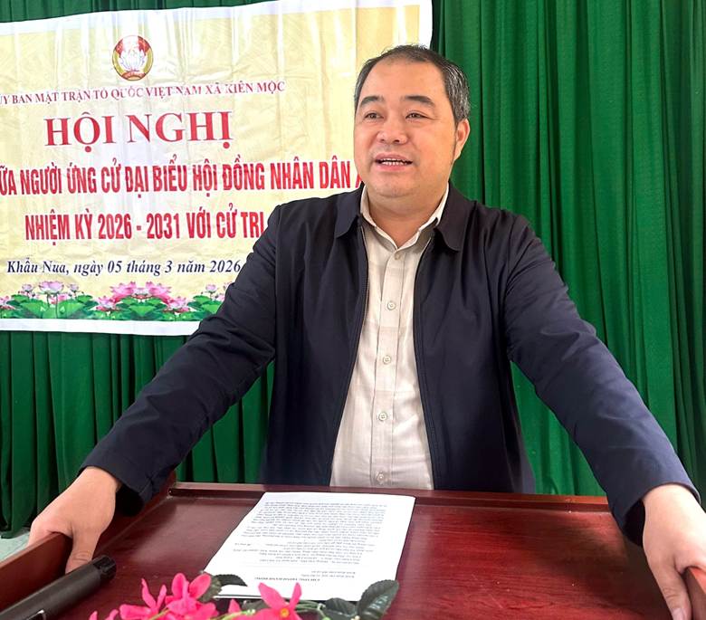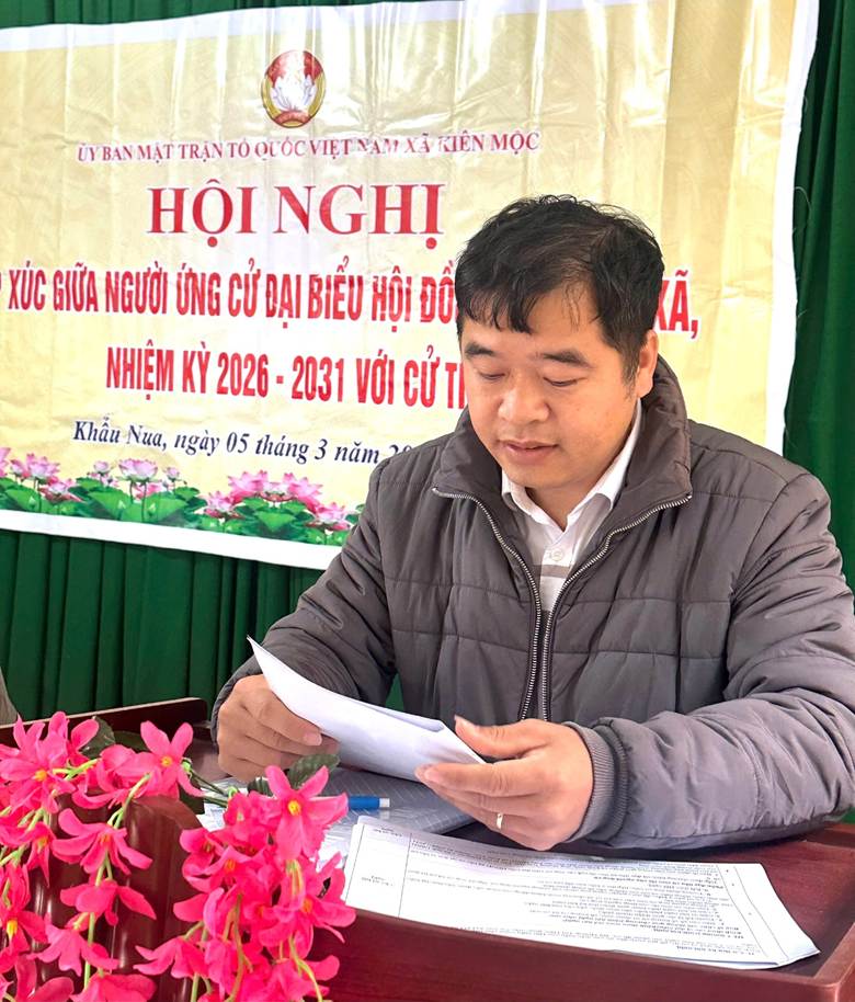 Sáng ngày 5/3/2026, Uỷ Ban MTTQ Việt Nam xã Kiên Mộc tổ chức hội nghị tiếp xúc giữa cử tri các thôn Nà Táng, Khẩu Nua, Pò Háng với những người ứng cử đại biểu HĐND xã nhiệm kỳ 2026 – 2031, đơn vị bầu cử số 06 gồm các ông bà; Hoàng Văn Hội – Phó bí thư Đảng uỷ, chủ tịch UBND xã; Bùi Văn Cường, Uỷ viên Ban Thường vụ Đảng uỷ, chủ nhiệm UBKT, Trưởng ban văn hoá xã hội HĐND xã; Nông Văn Huấn, Uỷ Viên BCH Đảng bộ, Phó trưởng ban VHXH HĐND xã; Nông Văn Sư, chuyên viên văn phòng HĐND, UBND xã; Chu Thị Diệu Thuý, chuyên viên MTTQ xã.