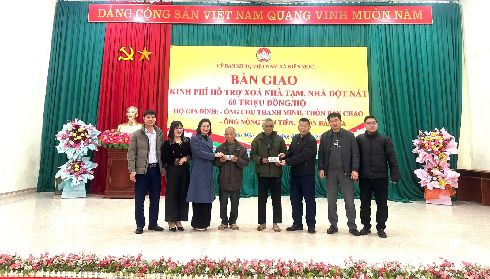 Ngày 10/2/2026, Uỷ Ban MTTQ Việt Nam xã Kiên Mộc bàn giao kinh phí hỗ trợ xoá nhà tạm, nhà dột nát cho các hộ gia đình có hoàn cảnh khó khăn trên địa bàn xã. Dự hội nghị có các đồng chí lãnh đạo HĐND, UBND, Uỷ Ban MTTQ Việt Nam xã và đại diện một số phòng, ban chuyên môn của xã.