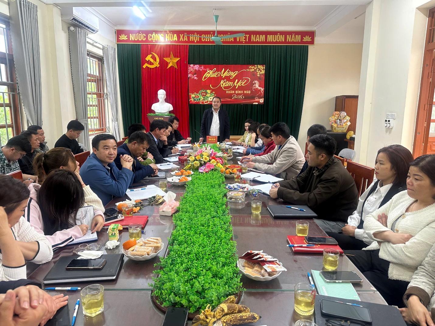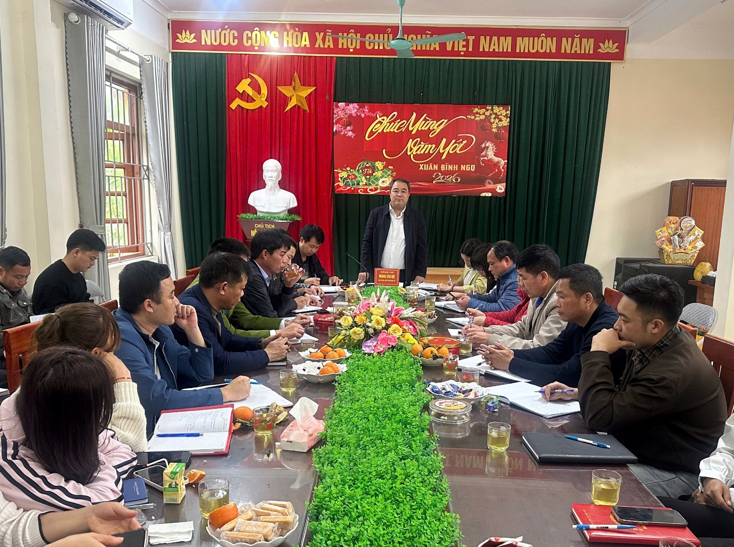 Phát biểu tại buổi gặp mặt, đồng chí Hoàng Văn Hội - Phó Bí thư Đảng ủy, Chủ tịch UBND xã, ghi nhận và biểu dương tinh thần trách nhiệm của đội ngũ cán bộ, công chức, viên chức người lao động trong việc thực hiện nhiệm vụ trực Tết, phục vụ Nhân dân chu đáo, không để gián đoạn công việc. Đồng chí đề nghị các cơ quan, đơn vị nhanh chóng ổn định nề nếp làm việc, siết chặt kỷ luật, kỷ cương hành chính và tập trung triển khai hiệu quả các nhiệm vụ sau: Đẩy mạnh sản xuất nông nghiệp, phấn đấu hoàn thành và vượt chỉ tiêu kế hoạch năm; Tăng cường công tác quản lý đất đai; Giữ vững quốc phòng - an ninh, đảm bảo trật tự an toàn giao thông; triển khai hiệu quả các nhiệm vụ phát triển kinh tế - xã hội đã đề ra; Trước mắt, tập trung tổ chức thành công Ngày Biên phòng toàn dân; chuẩn bị tốt các điều kiện cho cuộc bầu cử đại biểu Quốc hội khóa XVI và đại biểu HĐND các cấp nhiệm kỳ 2026 – 2031 và tổ chức tốt công tác giao, nhận quân năm 2026.